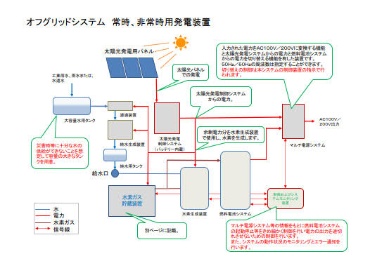 常用、非常時用発電装置例 ・燃料電池システム ・大容量水用タンク 搭載タイプ。 <ブロック図> |